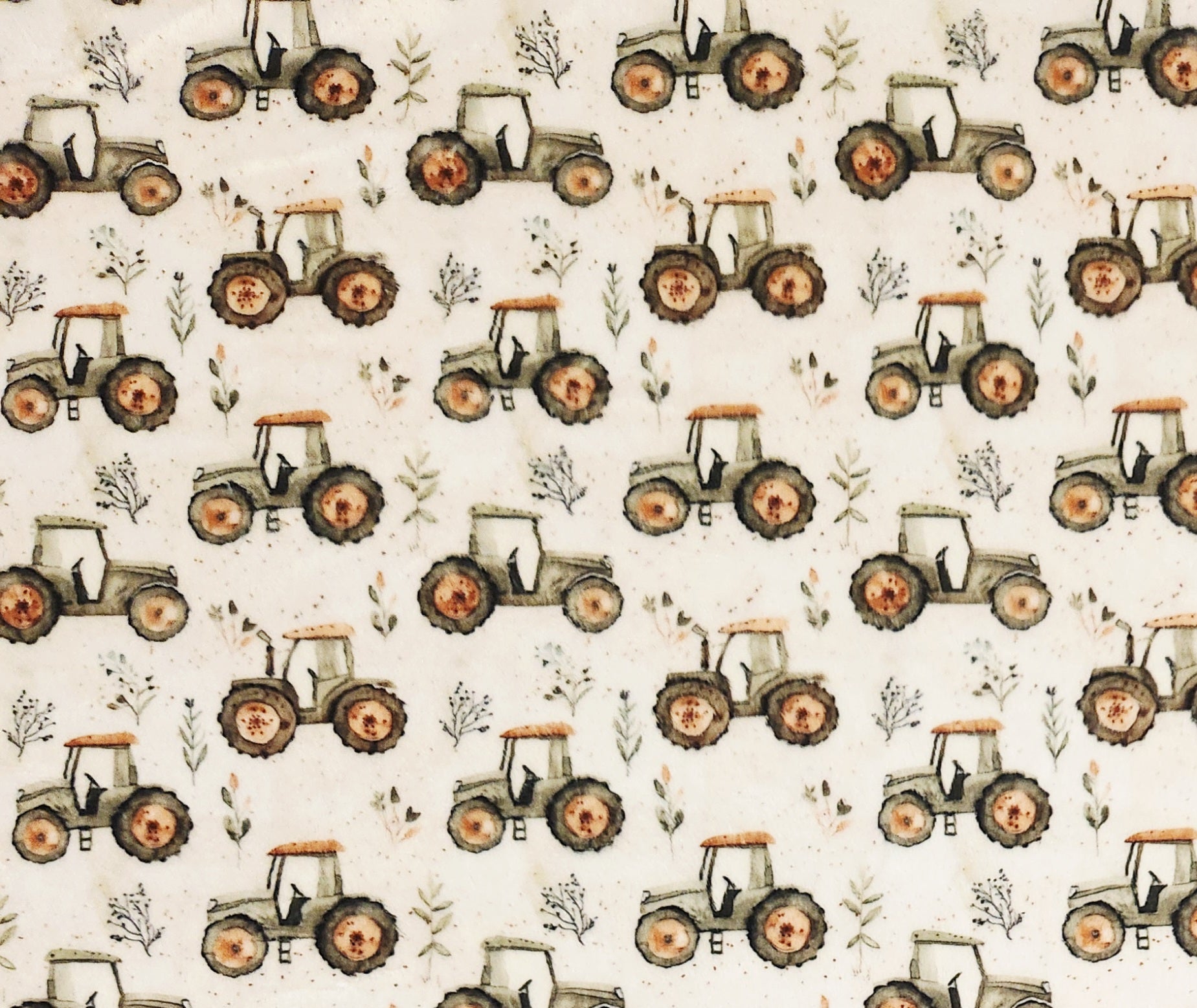 La délicatesse des couleurs ainsi que ses motifs de tracteurs, ce doux tissu en Minky fait tourner les regards.