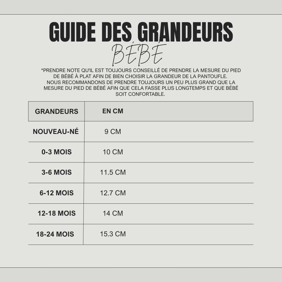 Valide pour 1 paire de pantoufles entre les grandeurs Nouveau-né et 12-18 mois inclusivement.